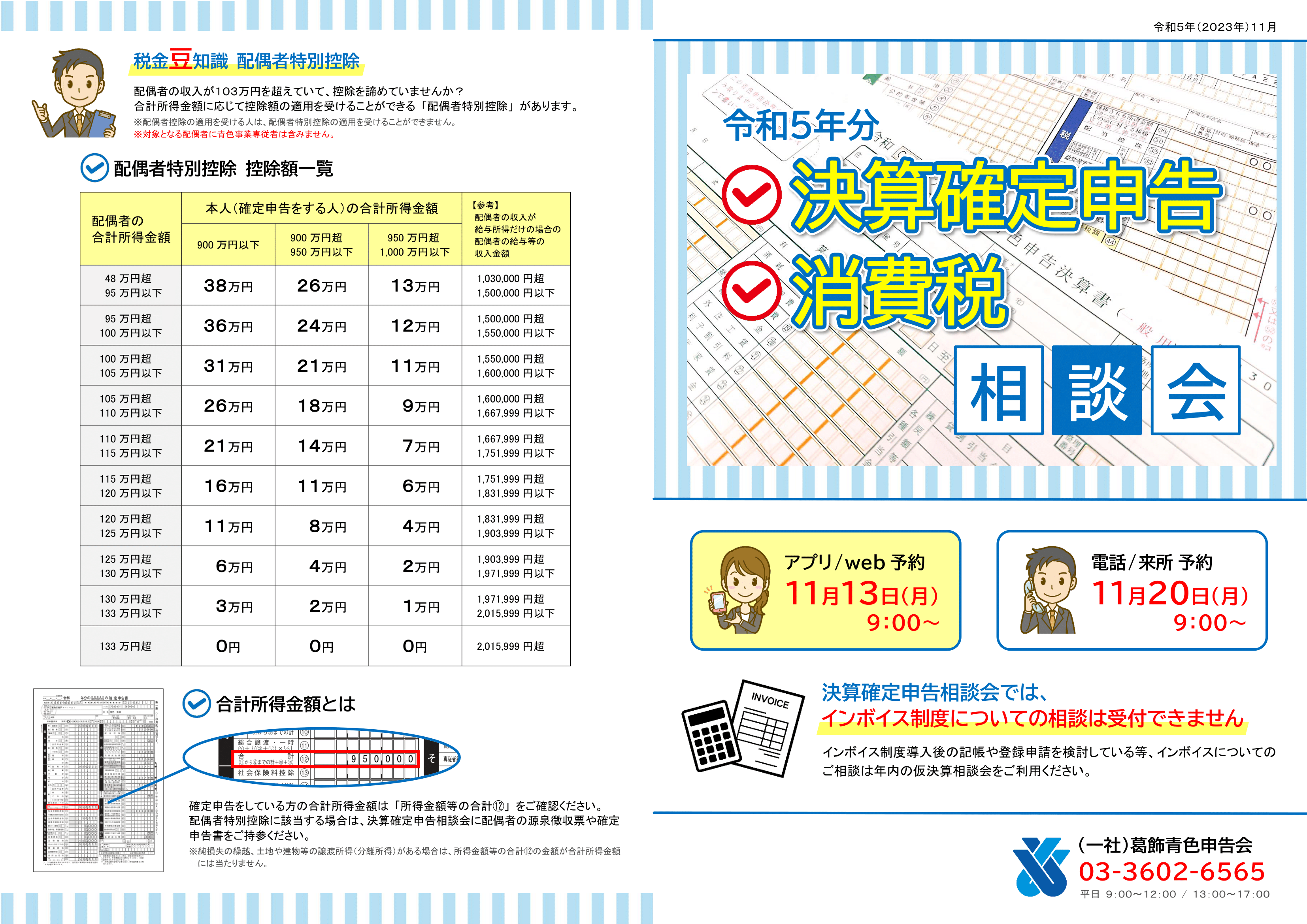 11月号にてご案内しておりました、年明けの決算確定申告相談会の予約が本日より始まりました。