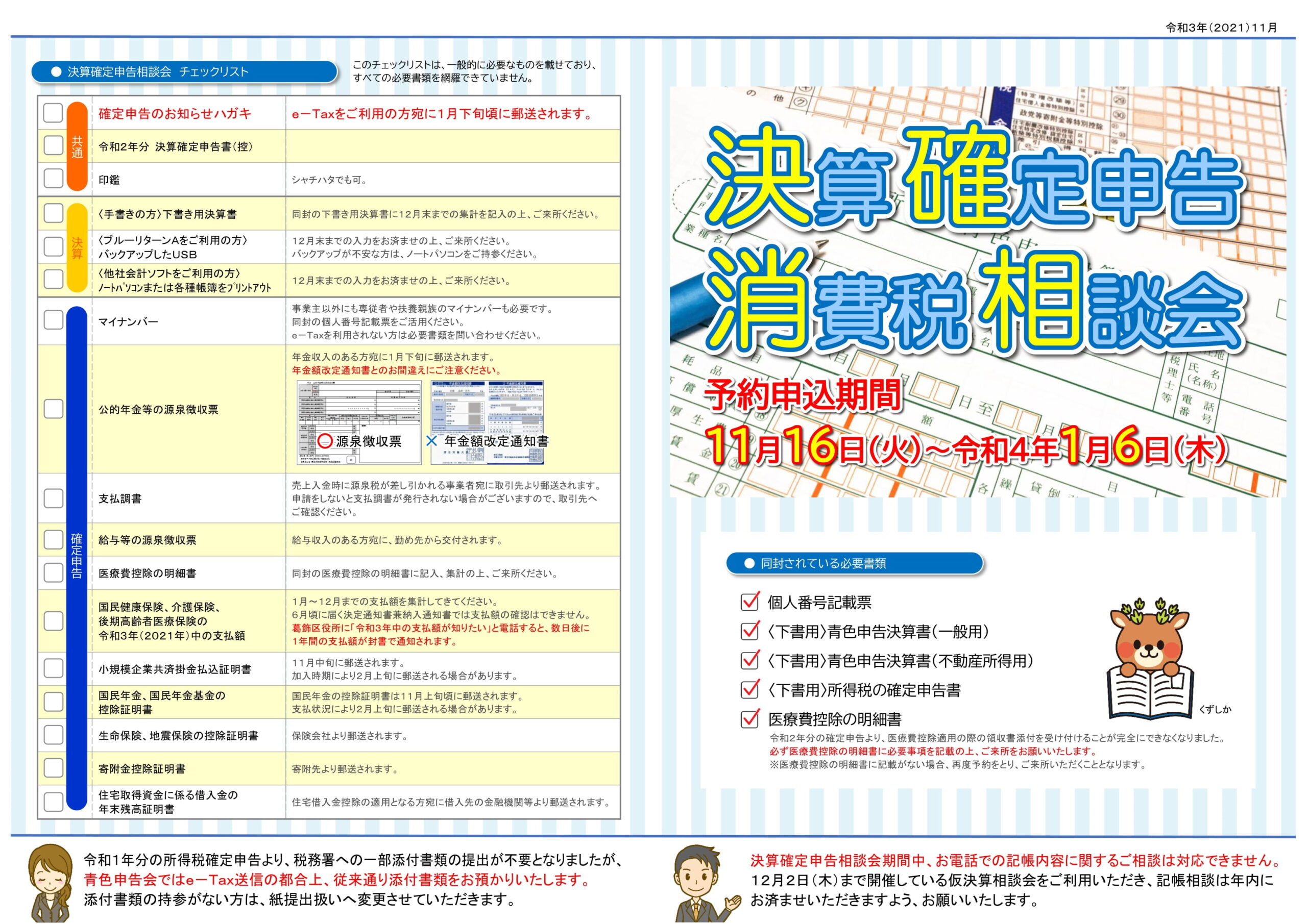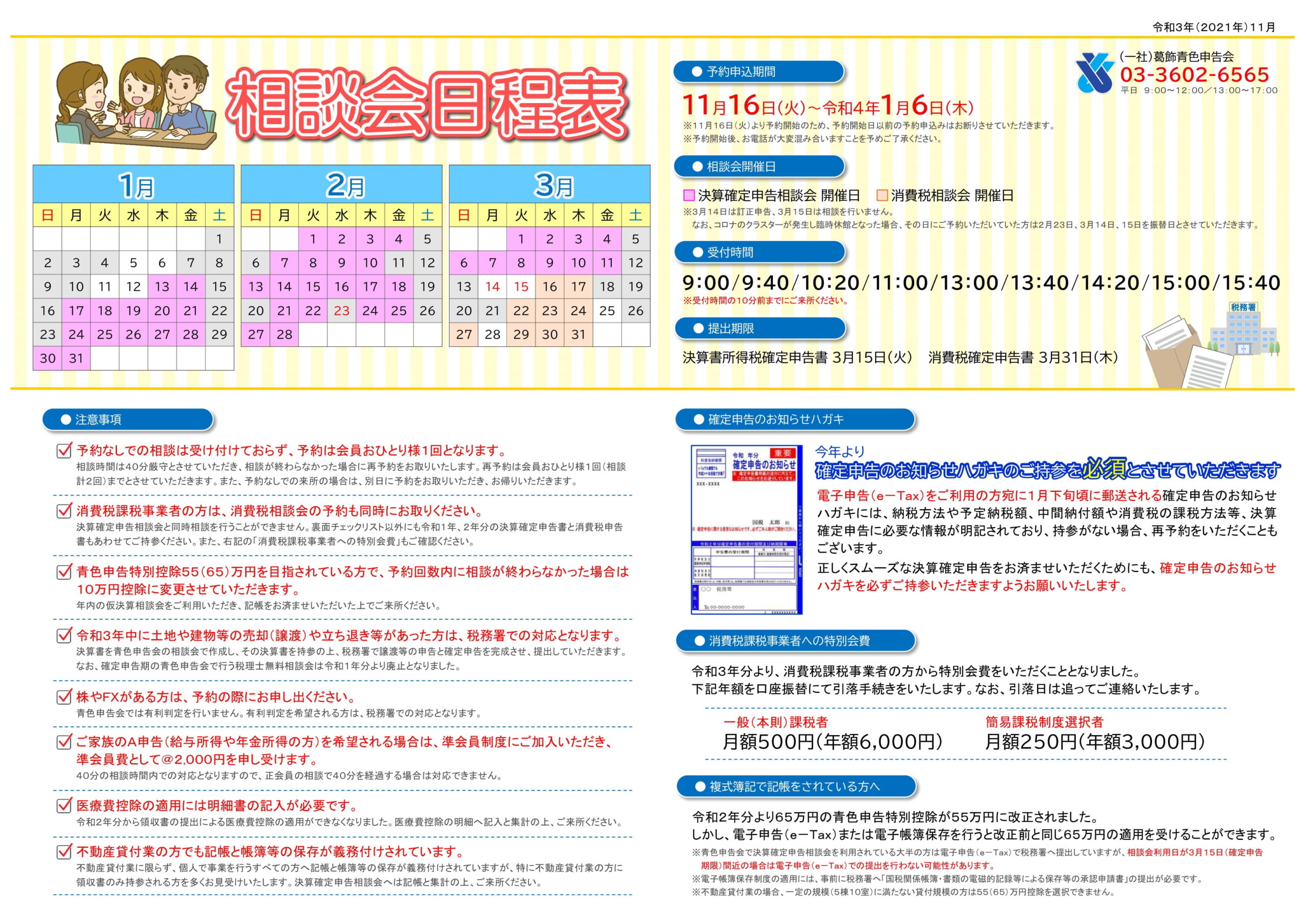 令和3年分の決算申告相談会の予約チラシが、葛飾青色申告会の11月号会報に同封されています。