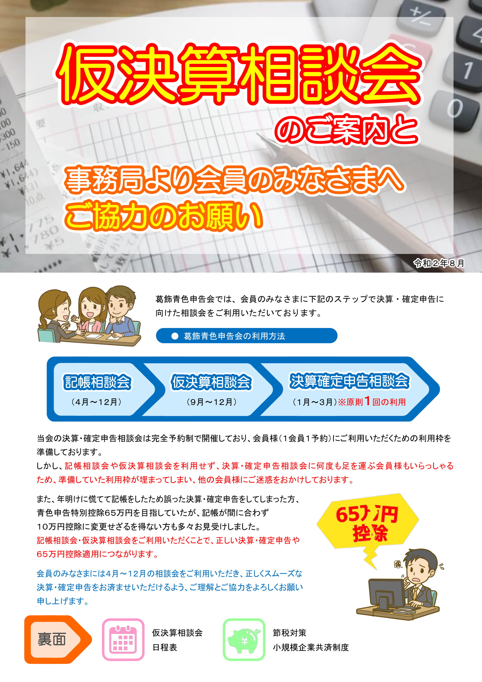 年明けの相談会をスムーズに進めるうえでの大切な相談会となります。詳しくは8月号同封の仮決算相談会チラシをご覧いただき、会員の皆様のご来所をお待ちしております。