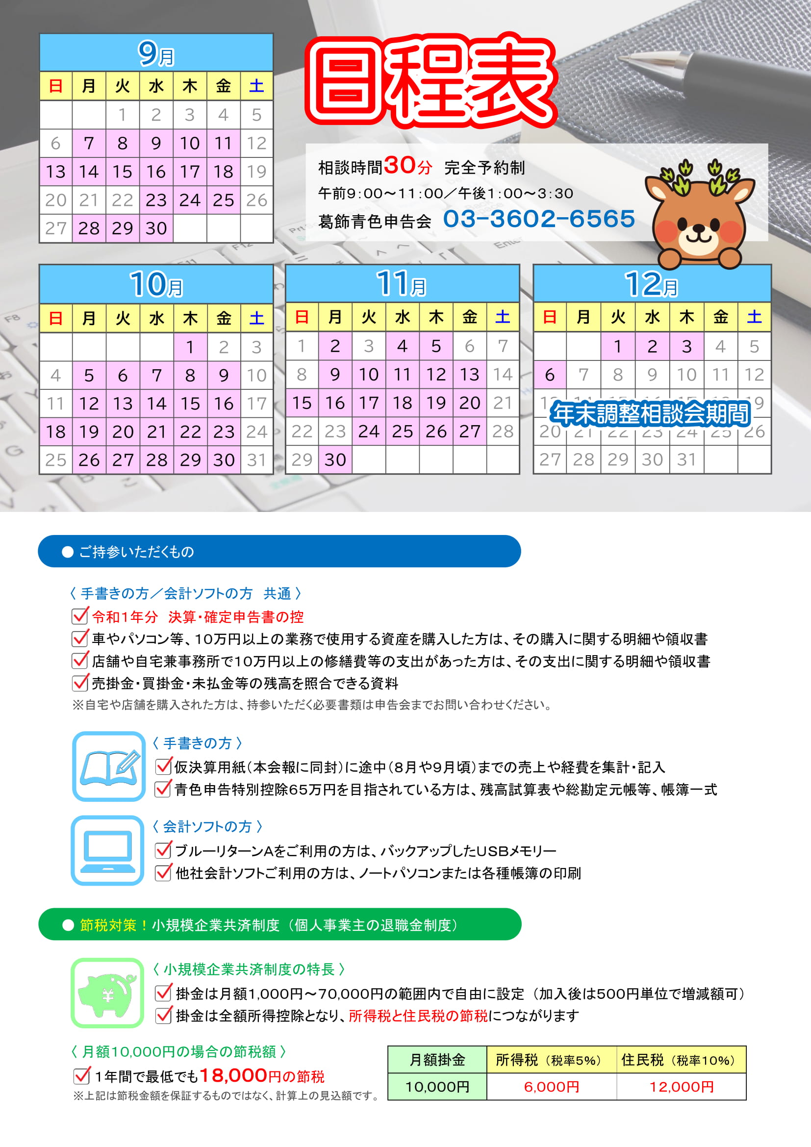 葛飾青色申告会では引き続き新型コロナウイルスの感染拡大防止に努めております。対面でのご相談についても、机に飛沫防止設備の設置や、相談席の間隔を空けるなどの各種対策を講じております。また、感染防止対策の一環として9月についても午後4時をもちまして営業終了(ご来所の受付は3時まで)とさせていただきます。
